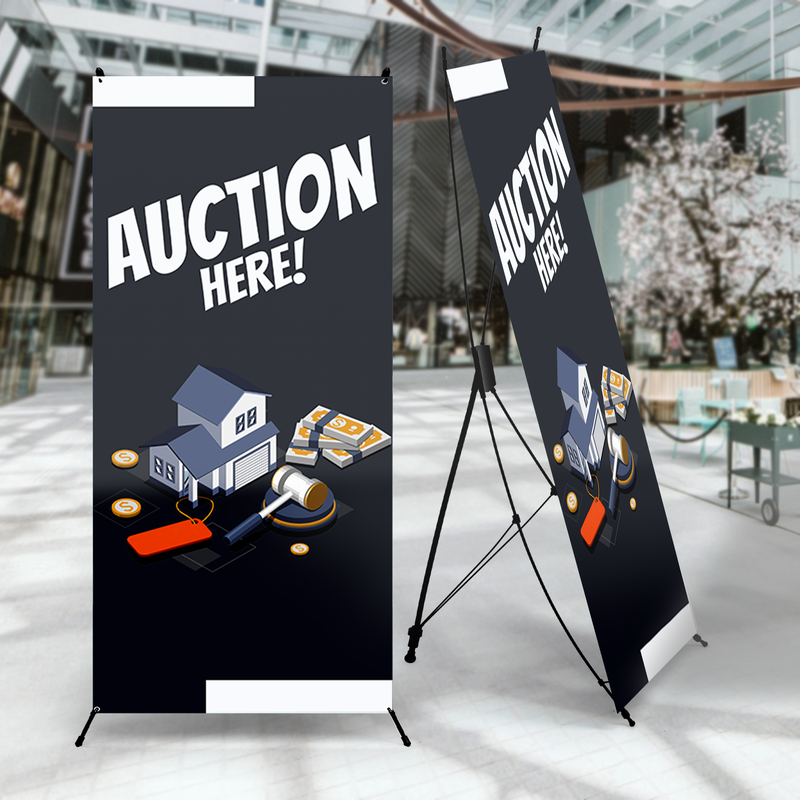 Enhance your event marketing with a high-quality X-Banner designed to clearly display that your auction is happening Here.