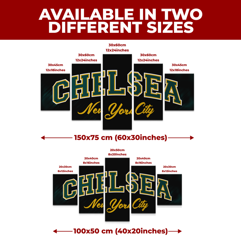 Add urban energy and bold style to your walls with this Chelsea & New York City 5-piece wall canvas. Featuring a dynamic design with varsity-inspired lettering and a modern layout, this artwork perfectly blends city pride and contemporary décor. Ideal for living rooms, offices, studios, or modern spaces.