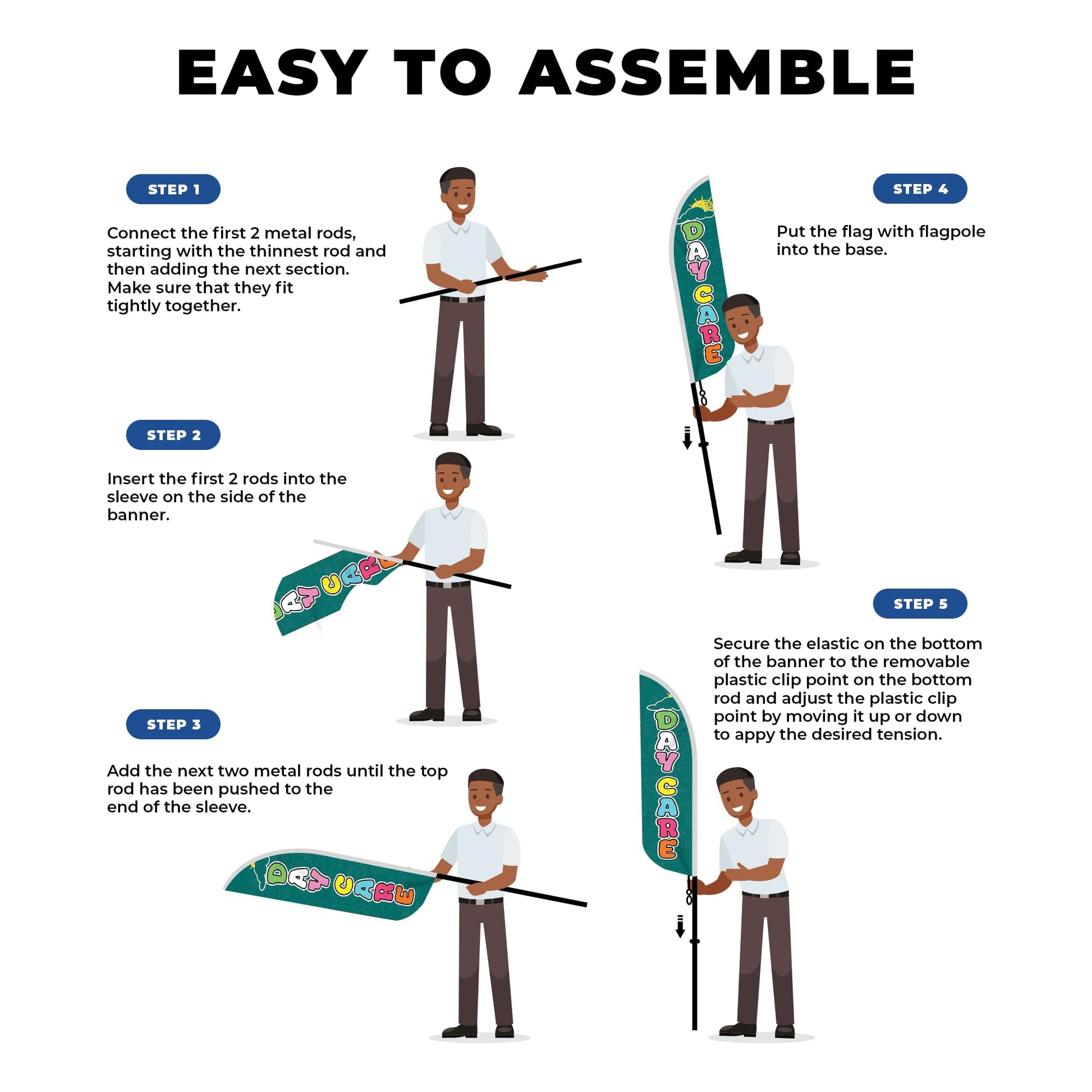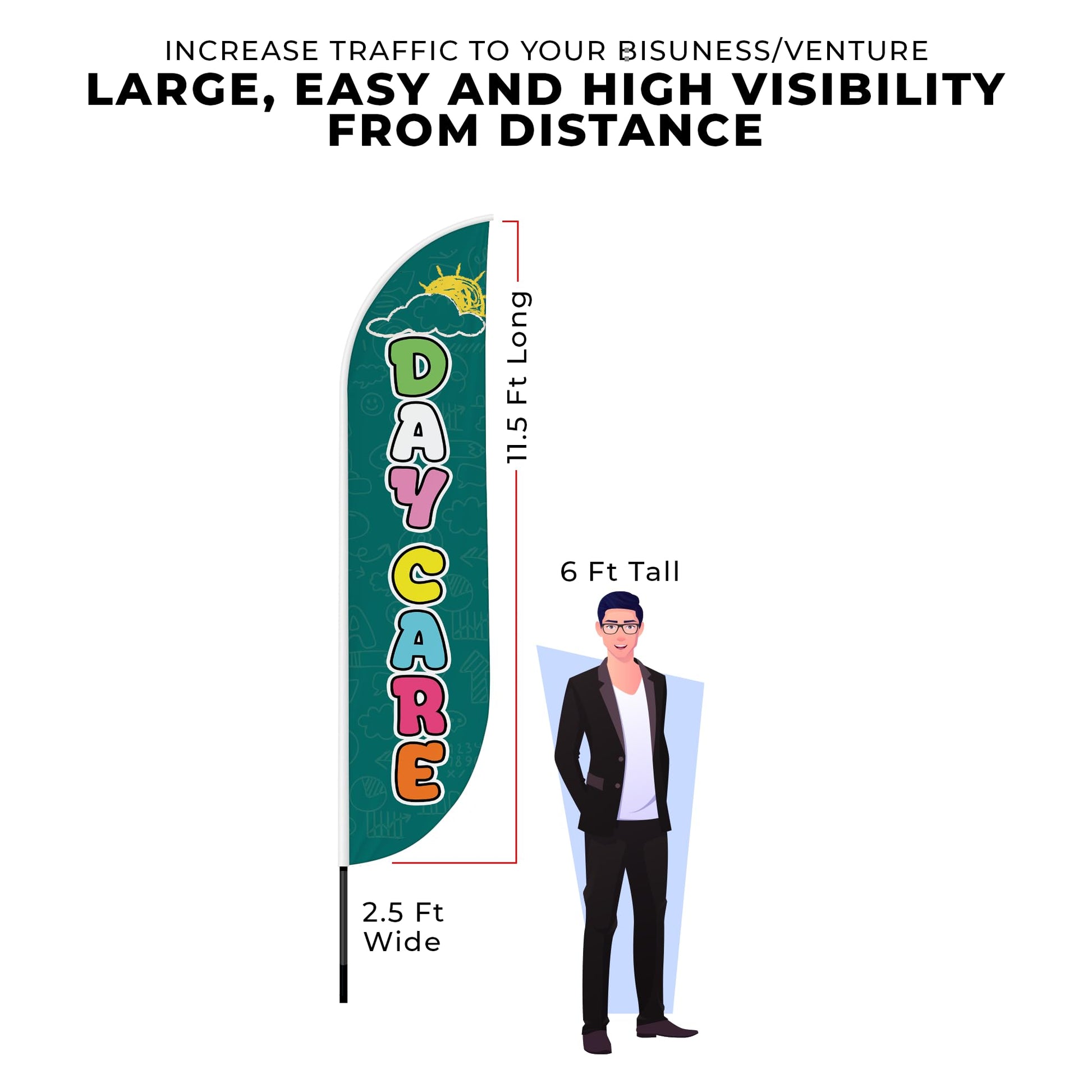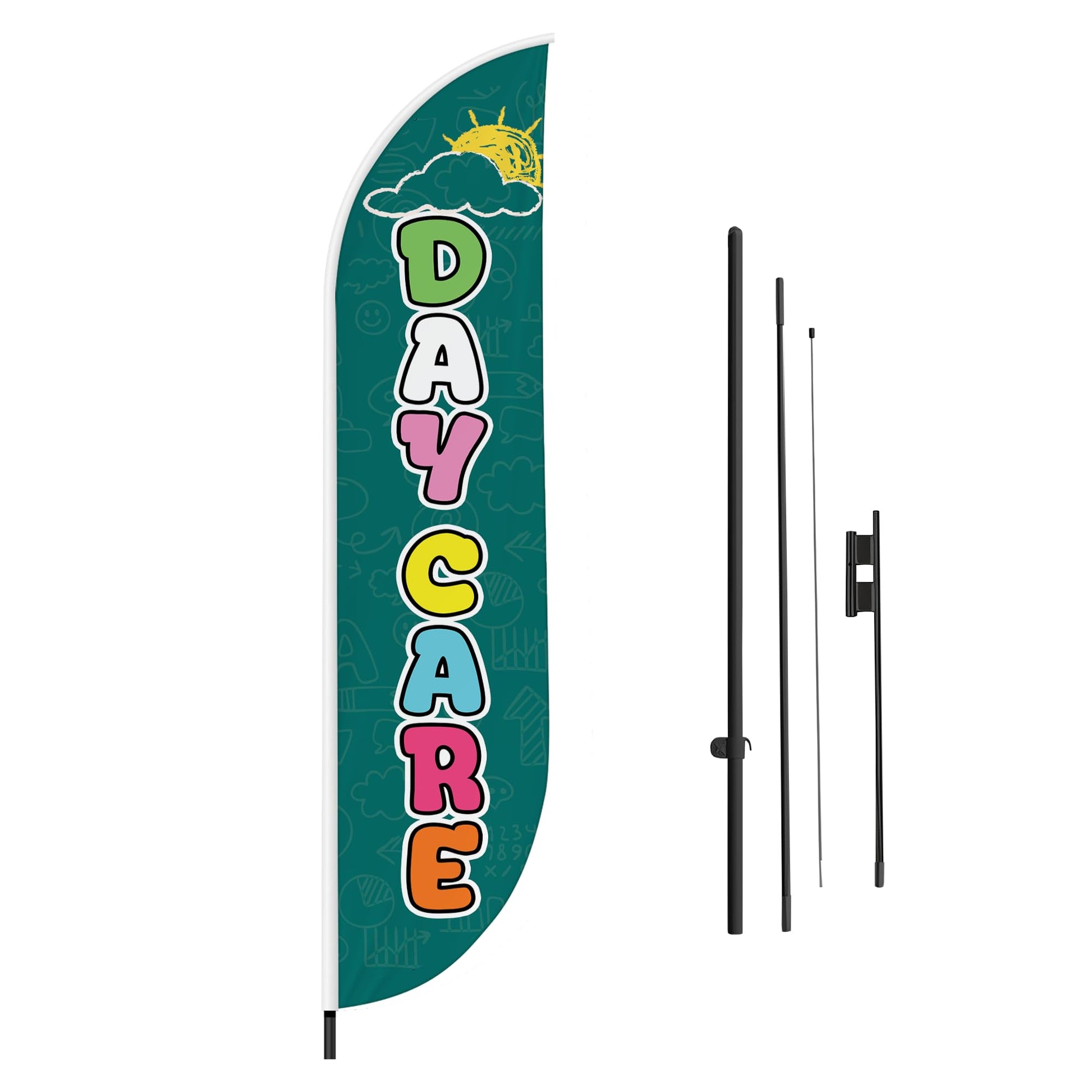 Make your childcare center easy to find with the bright and welcoming DAY CARE Feather Flag. Perfect for daycare facilities, preschools, or early learning centers, this flag helps parents notice your services instantly.