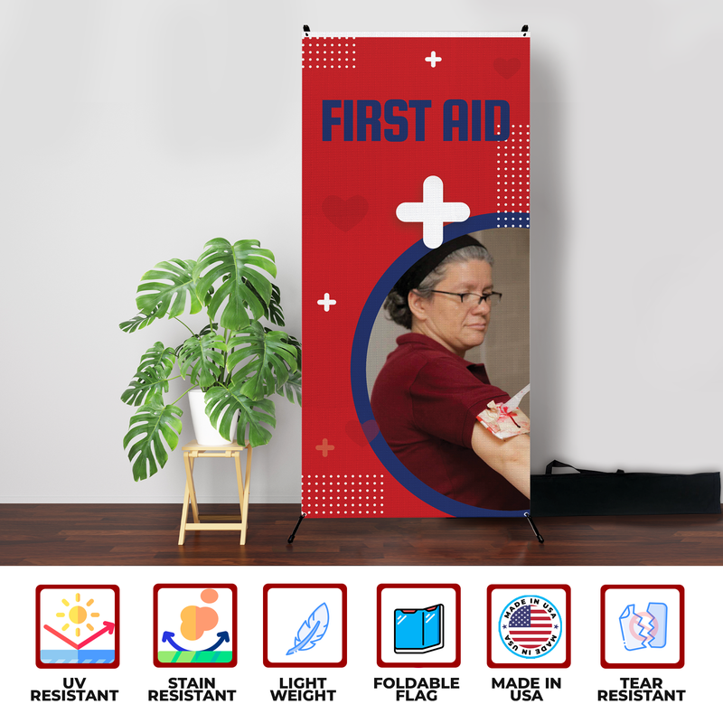 Ensure safety and quick access to care with a high-quality X-Banner designed to clearly communicate first aid availability.
