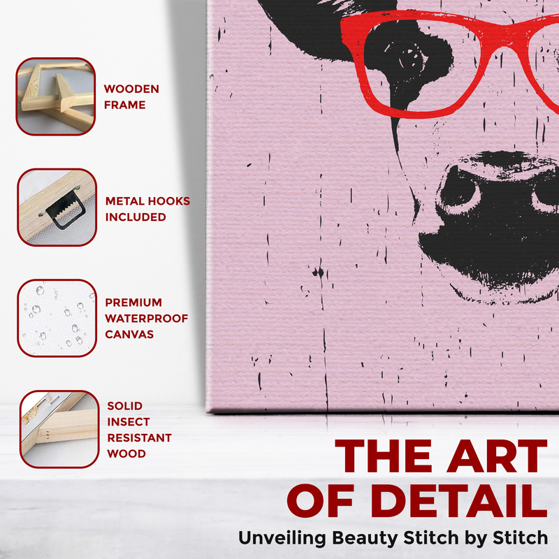 Printed on premium-quality canvas and stretched over a solid wood frame, it’s waterproof, fade-resistant, and proudly made in the USA. Every quirky detail, from the cow’s curious expression to its bold features, stays crisp and engaging, creating a cheerful piece that instantly brightens your wall.