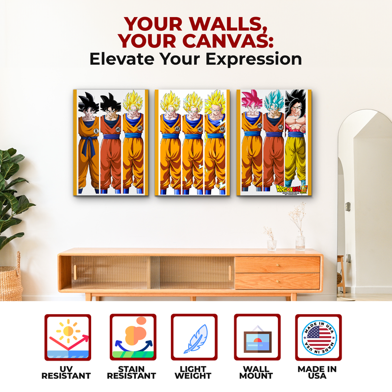 Celebrate the legendary journey of Goku with this stunning multi-panel wall canvas, showcasing his evolution through every iconic transformation: Base Form, Super Saiyan 1, Super Saiyan 2, Super Saiyan 3, Super Saiyan God, Super Saiyan Blue, and Super Saiyan 4. Each panel captures the power, determination, and spirit of the Saiyan hero in vibrant detail.