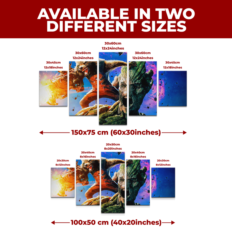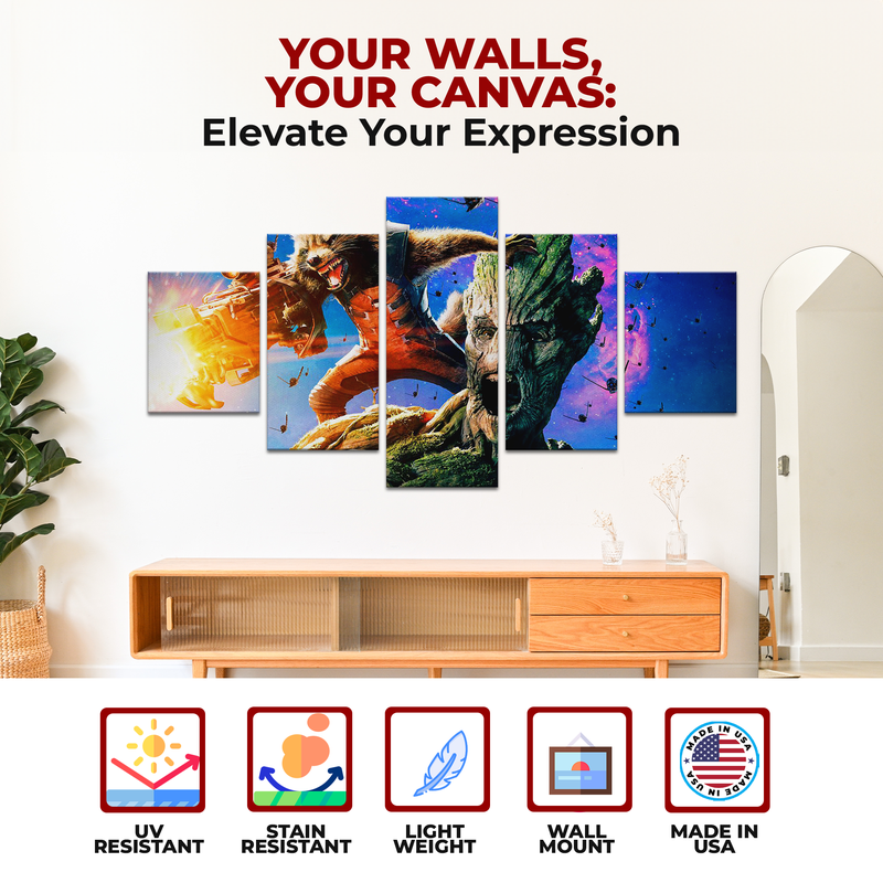 Bring humor, heart, and intergalactic style to your space with this vibrant Groot & Rocket 5-piece wall canvas. Featuring the iconic duo in an action-packed, expressive design, this artwork captures their unique bond — Rocket’s fearless attitude paired with Groot’s lovable charm. Perfect for Marvel fans who want a fun, energetic centerpiece for their bedroom, gaming room, or entertainment area.