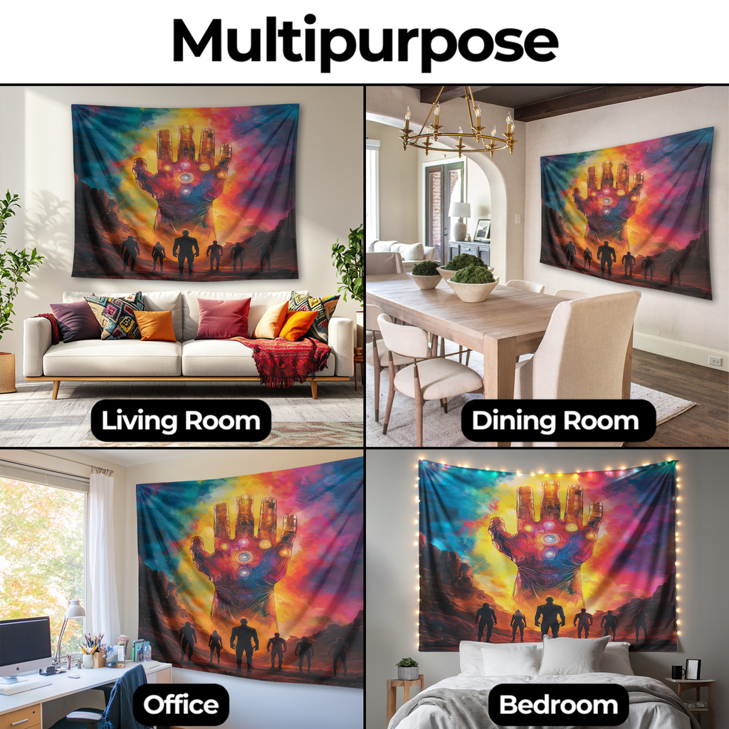 💎🖐️ Harness the ultimate power of the universe with the Infinity Gauntlet Conqueror Wall Tapestry. Inspired by the legendary gauntlet that controls space, time, and reality itself, this tapestry brings cosmic intensity, iconic Marvel energy, and unstoppable dominance into your space.