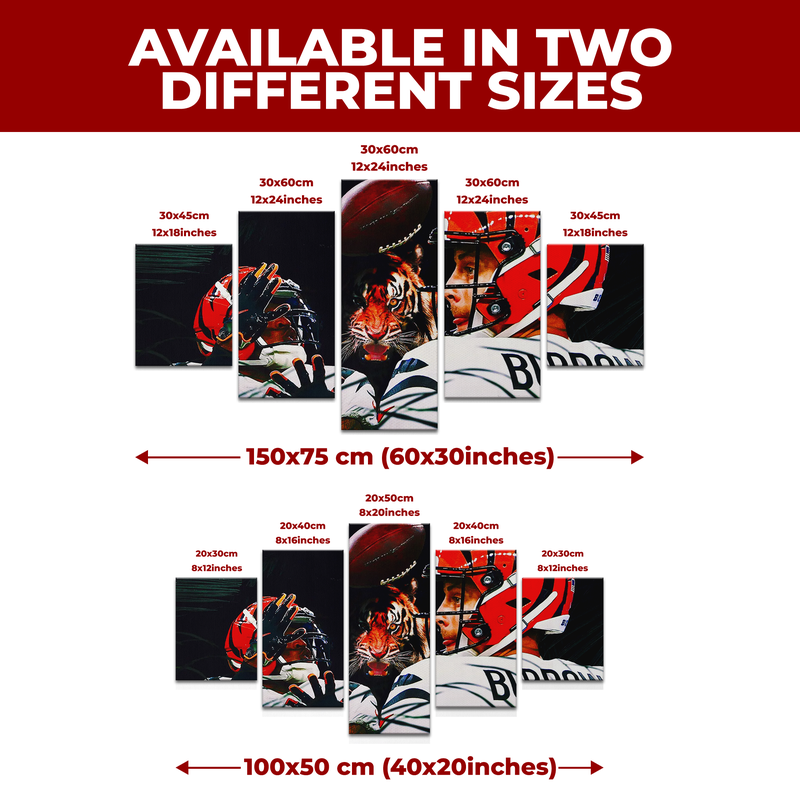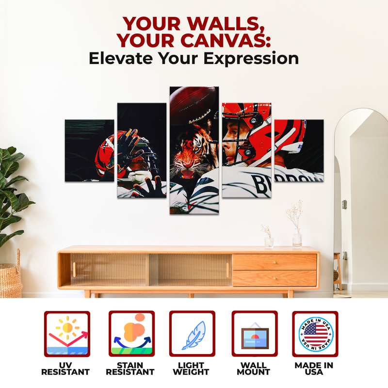 Celebrate the explosive connection between two of football’s brightest stars with this Ja’Marr Chase & Joe Burrow 5-piece wall canvas. Featuring a high-definition design of the Cincinnati Bengals’ iconic duo in action, this artwork captures their power, precision, and undeniable chemistry on the field. Perfect for die-hard Bengals fans and collectors of NFL-inspired art.