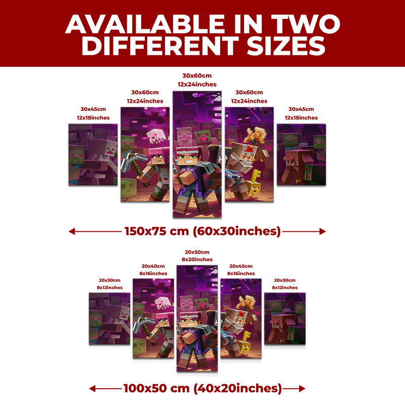 Bring the blocky adventures of Minecraft to life with this colorful 5-piece wall canvas. Perfect for fans of creativity, exploration, and building, this artwork captures the fun and imagination of the game’s pixelated world — ideal for gaming rooms, bedrooms, or kids’ spaces.