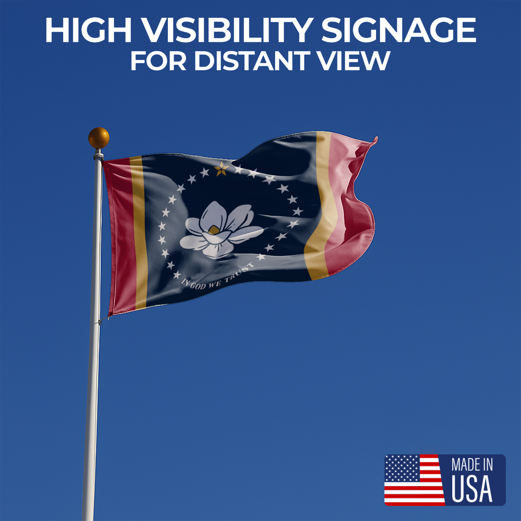 Whether displayed at home, school, or a public venue, the Mississippi State Flag delivers strength, movement, and authentic state pride—proudly Made in the USA.