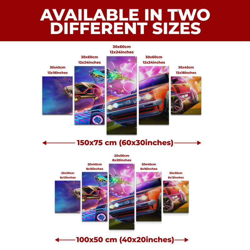 Bring the speed, energy, and excitement of Rocket League to your walls with this dynamic 5-piece wall canvas. Perfect for fans of fast-paced action and competitive gameplay, this artwork captures the fusion of cars and soccer in a bold, high-energy design — ideal for gaming setups, bedrooms, or entertainment rooms.